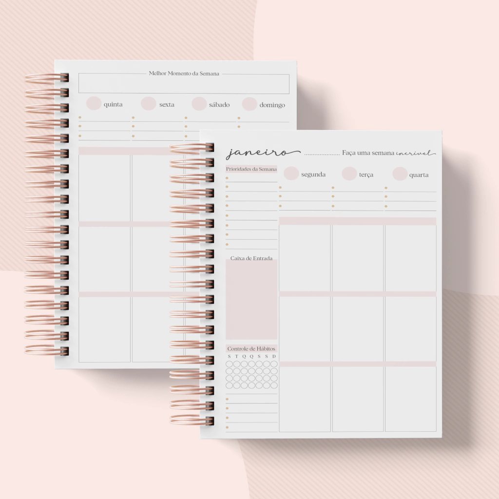 • Acabamento padrão: Capa dura | Elástico para fechamento | Bolso plástico para documentos | Divisórias